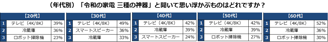 世代別に見ると、30代~40代ではスマートスピーカーが上位に入るものの、他の世代はこの3つで共通。テレビはわかりますが、冷蔵庫の人気が高いのはやや意外です。