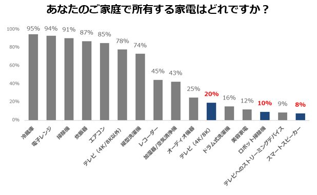 ただこの順位は、三種の神器として思い浮かべる物なので、実際に所有しているかは別の話。冷蔵庫の所有率こそ高いですが、他のものの普及はまだこれからといった感じです。 ロボット掃除機は先進的な家電として捉えられているのかもしれません。