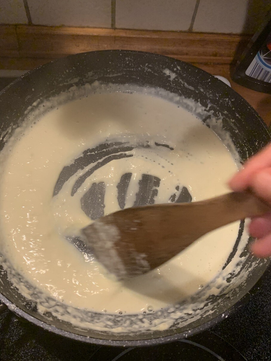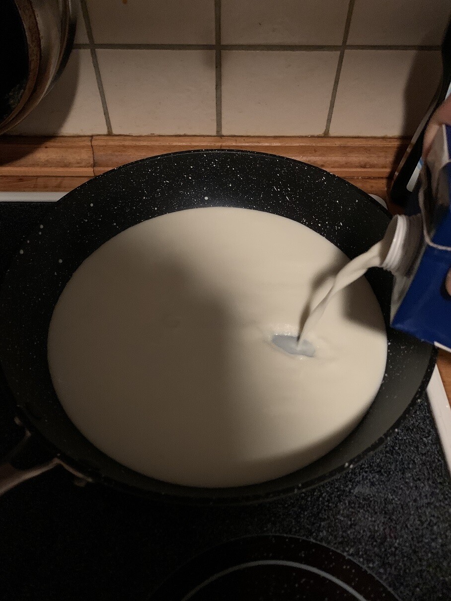 フライパンに牛乳を一気に入れて熱します。