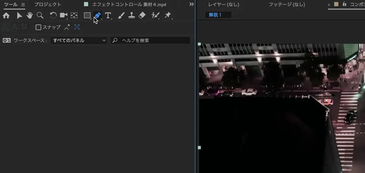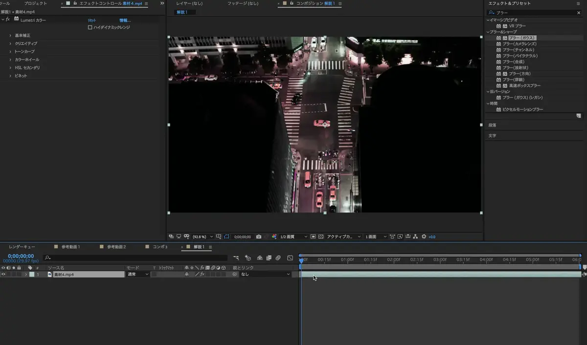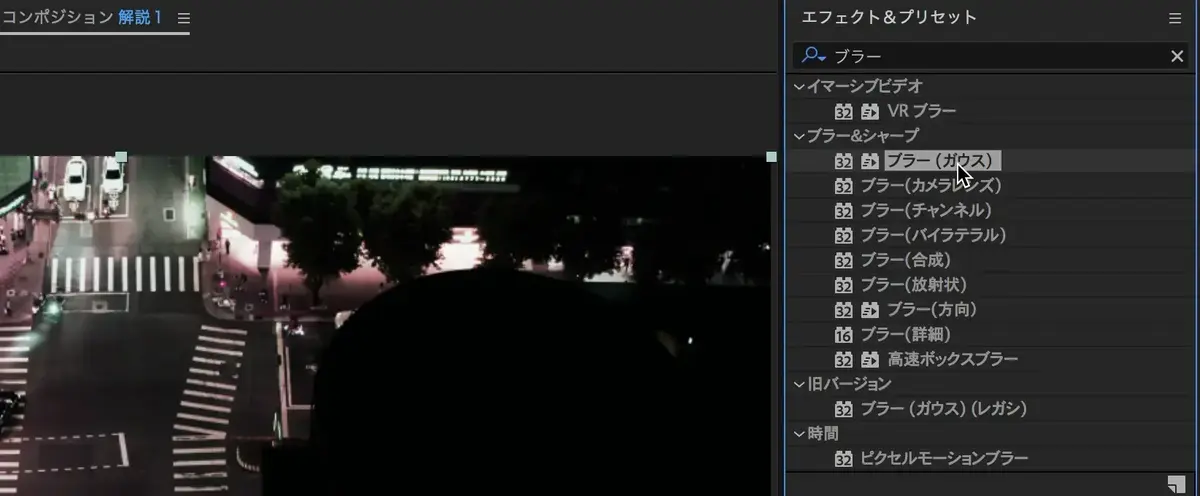 Aftereffectsを開きタイムライン上に素材を配置できたら、エフェクト検索に進みます。
