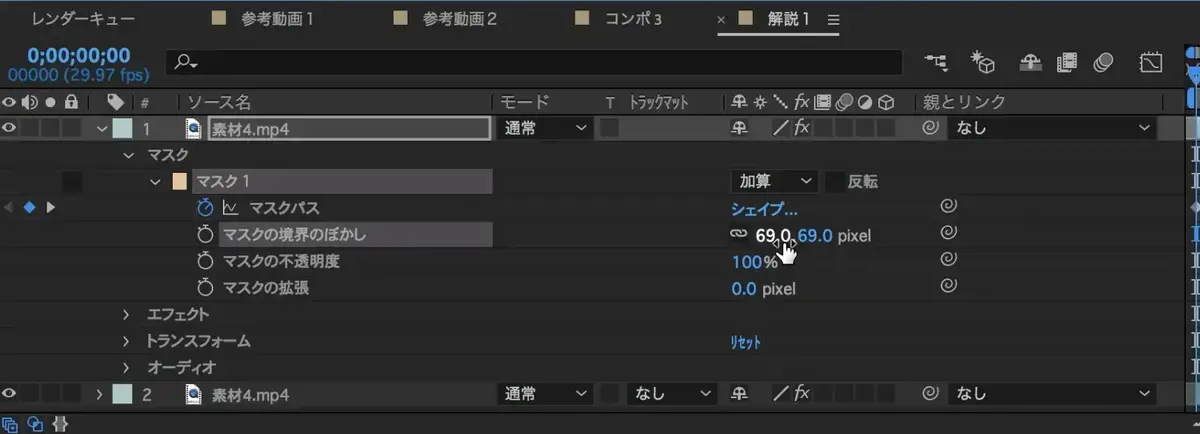 調整し終えたら、マスク境界のぼかし値を69に変更します。(この値はお好みで調整してください)