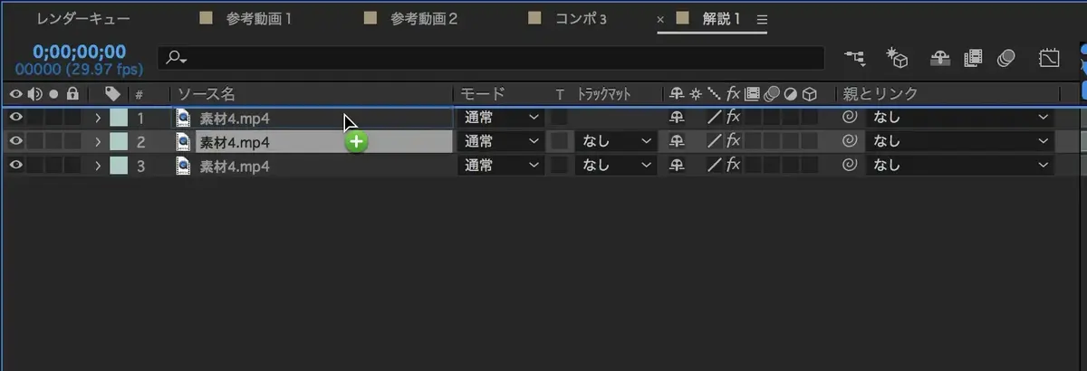 それでは、第二工程に入っていきます。編集(マスクがけ)をしていないCC Light Raysが適応されている素材を複製