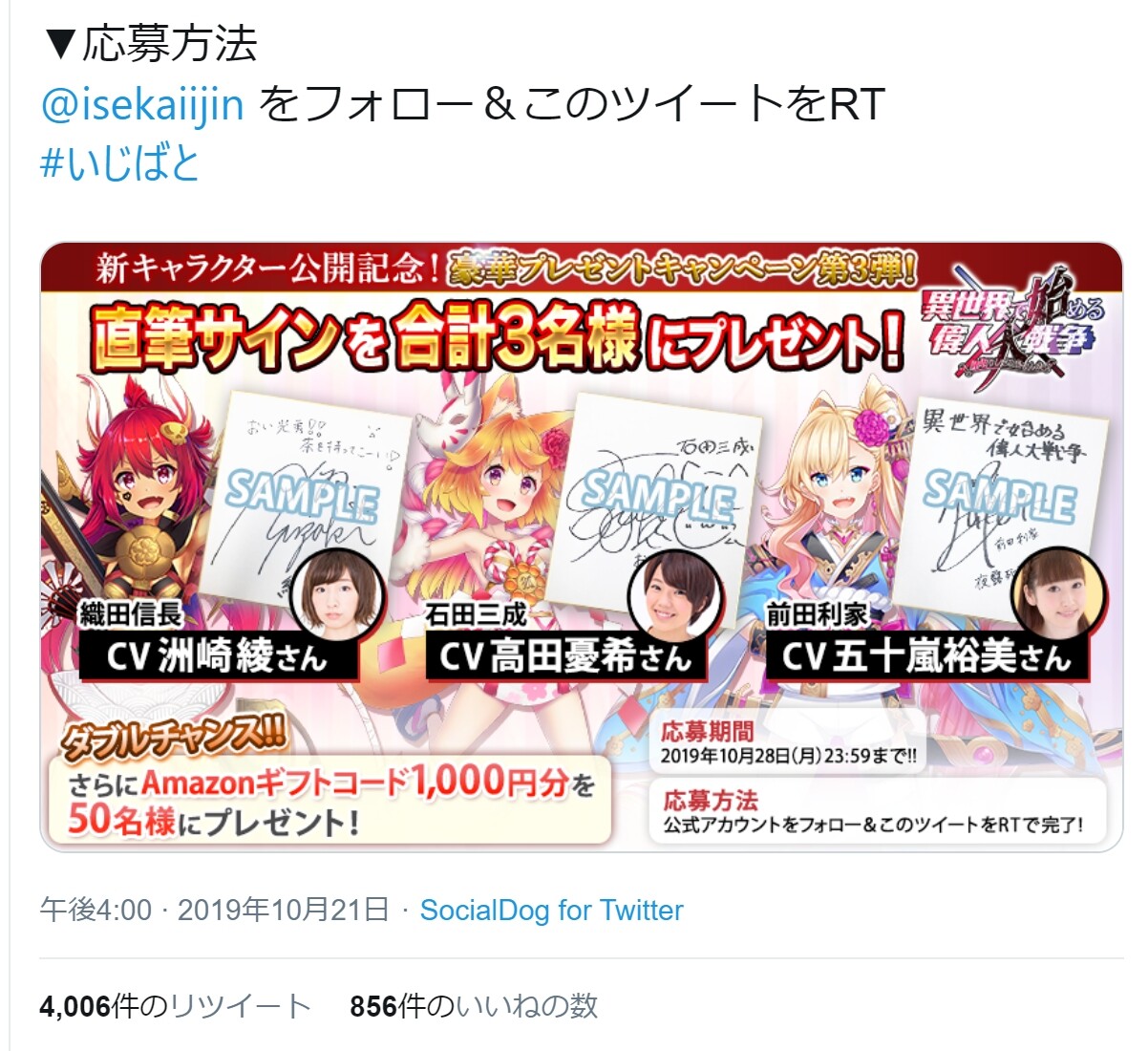 ※RTキャンペーンは声優色紙も当たるため『いじばと』と『英雄王』で異なる