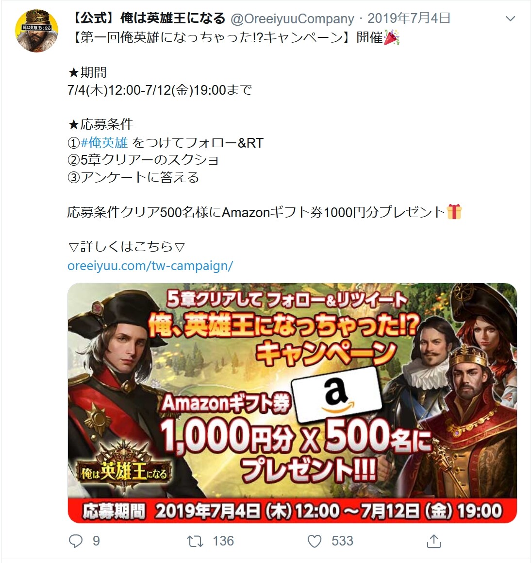 TwitterでもAmazonギフト券1,000円を500人がもらえるリツイートキャンペーンを実施して、ツイートRT数が136人。Amazonギフト券の応募が定員を割ることって、あるんですね……。