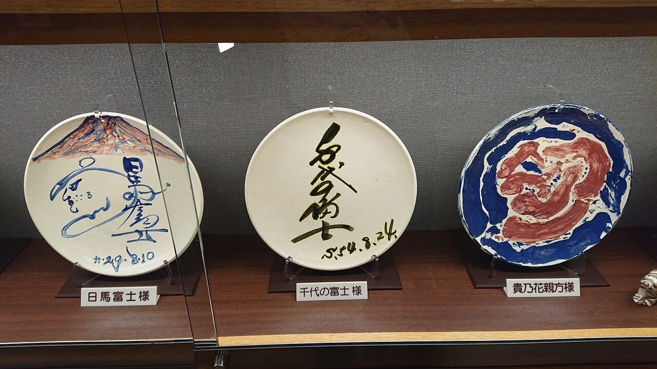 また素焼き陶器の手作り体験コーナーがあり,宿泊した有名人の制作物が陳列されていた。一番上手かったのは原哲夫の絵付けした皿。あとは好角家として日馬富士の見事な山(多分蔵王山?)の絵付け皿を挙げておく。他に千代の富士・貴乃花・瀬戸内寂聴・上野千鶴子と挙げておけばかなりジャンルがバラバラなことが察せられるだろう。