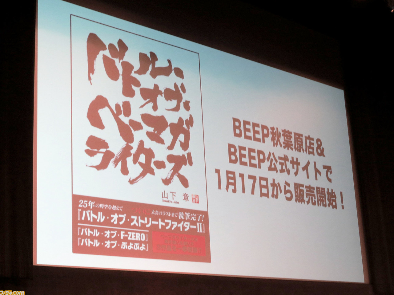 最後に、山下氏からとっておきのサプライズが。1991年、ベーマガ編集部内では対戦型格闘ゲーム『ストリートファイターII』の大会が行われ、その模様は山下氏により『バトル・オブ・ストリートファイターII』という連載小説の形で綴られたが、未完のまま終わっていた。それがこのたびついに完結し、全編を収録した書籍『バトル・オブ・ベーマガライターズ』が発売になると告知されたのだ。閉演後にロビーで限定版が販売された同書だが、今後はBEEP秋葉原店とBEEP公式サイトで販売されるとのこと。