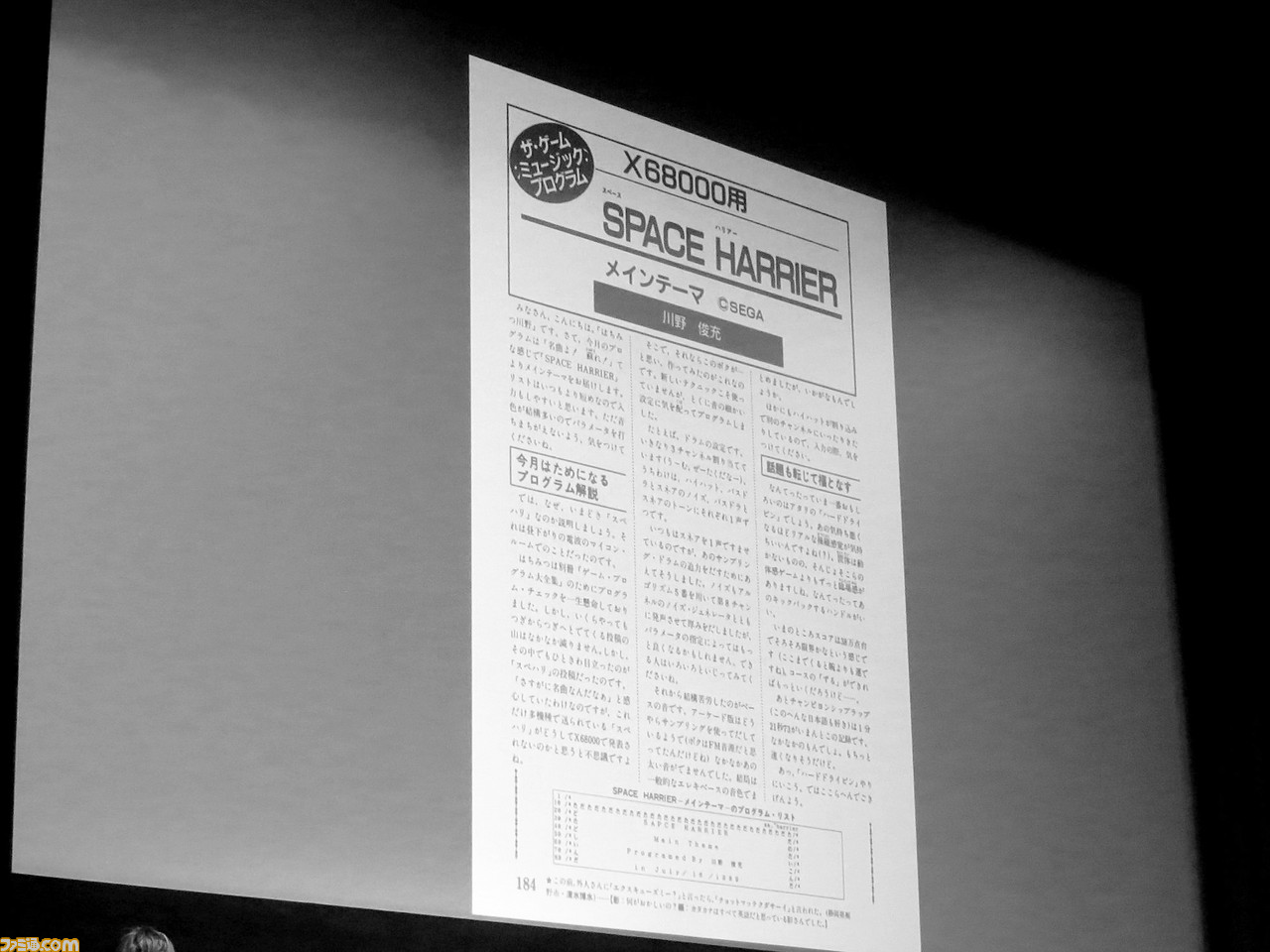 第3部の“DEMPAサウンドチーム クロストーク”には、アーケードなどのゲーム音楽をパソコンで鳴らす“ミュージックプログラムコーナー”で活躍したり、電波新聞社から発売されたゲームソフトでサウンドを担当していた、5名のスタッフが出演。“YK-2”名義で活動していたゲーム音楽の第一人者・古代祐三氏も登壇し、掲載当時「ゲーセンで曲を覚えてきて作ったんだったかな」という『グラディウス』のプログラムや、自身が創作した『イース』、『ソーサリアン』の楽曲について振り返った。日本ファルコム時代の曲について、公的な場で語るのはこれが初めてだそうで、「自分の作品のなかでどのゲームの曲がいちばん好きかと聞かれたら、たぶん『ソーサリアン』だと答える」と古代氏。