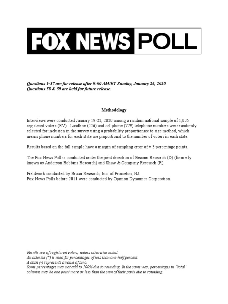 Interviews were conducted January 19-22, 2020 among a random national sample of 1,005 registered voters (RV). Landline (226) and cellphone (779) telephone numbers were randomly selected for inclusion in the survey using a probability proportionate to size method, which means phone numbers for each state are proportional to the number of voters in each state. Results based on the full sample have a margin of sampling error of ± 3 percentage points. The Fox News Poll is conducted under the joint direction of Beacon Research (D) (formerly known as Anderson Robbins Research) and Shaw & Company Research (R). Fieldwork conducted by Braun Research, Inc. of Princeton, NJ. Fox News Polls before 2011 were conducted by Opinion Dynamics Corporation.