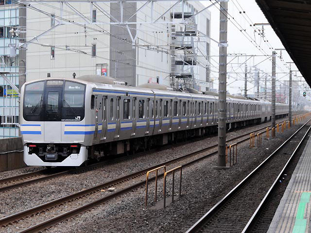 ★ 小さい写真で申し訳ないが、Y102編成。東海道線で一時期活躍していたが、戻る際に更新を受けてリニューアル。モーター等が交換され、外観的には帯の色が変更となり、運転台下のE217という文字が消えてJRになっている。列番がLED。再度貸出されたが、2015/3ダイヤ改正で返却された。 (新川崎) ★ 下総中山にて。こちら |