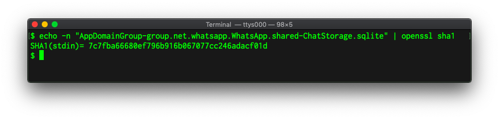 The file we are after is WhatsApp's ChatStorage.sqlite file, whose full pathname on the iPhone hashes to "7c7fba66680ef796b916b067077cc246adacf01d".