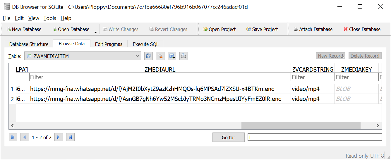 I use "sqlitebrowser", which runs as a GUI on Windows, macOS, and Linux. Below is a screenshot. As you can see, the filename is the file we copied in the step above, the hash of the original name. I then click on "Browse Data" and select the table ZWAMEDIAITEM. I see a list of those URLs in the column ZMEDIAURL, and the corresponding decryption keys in the column ZMEDIAKEY.