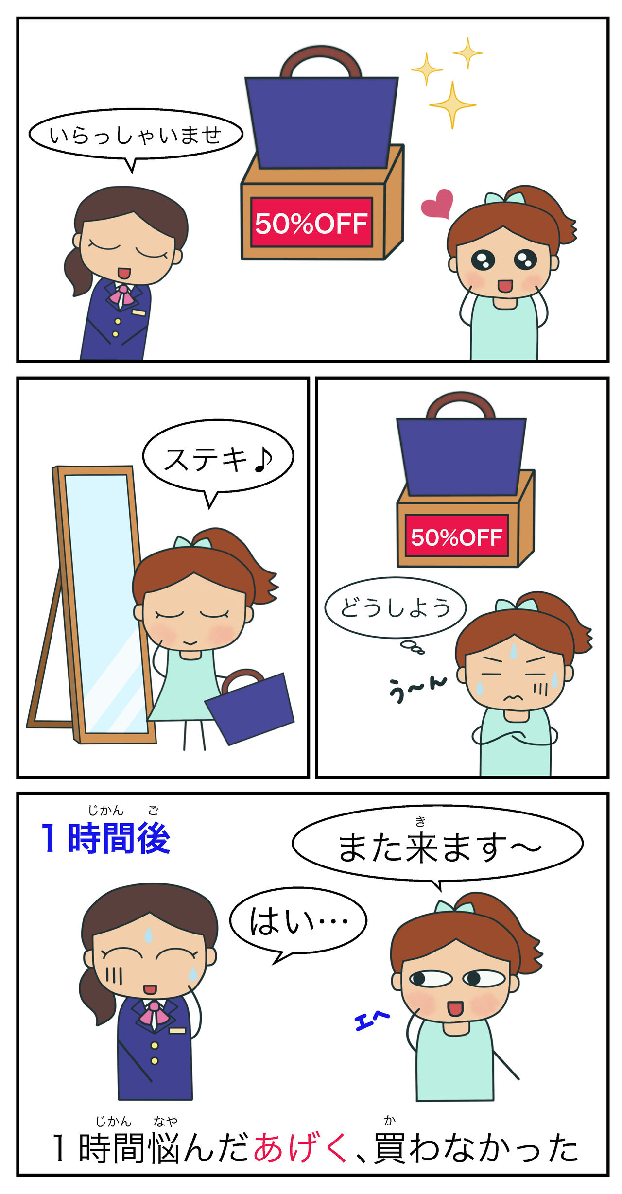 ①1時間(じかん)悩(なや)んだあげく、買(か)わなかった