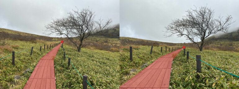 空間に広がりが出ているのが分かると思います。また右の木もしっかり立っているように感じられます。