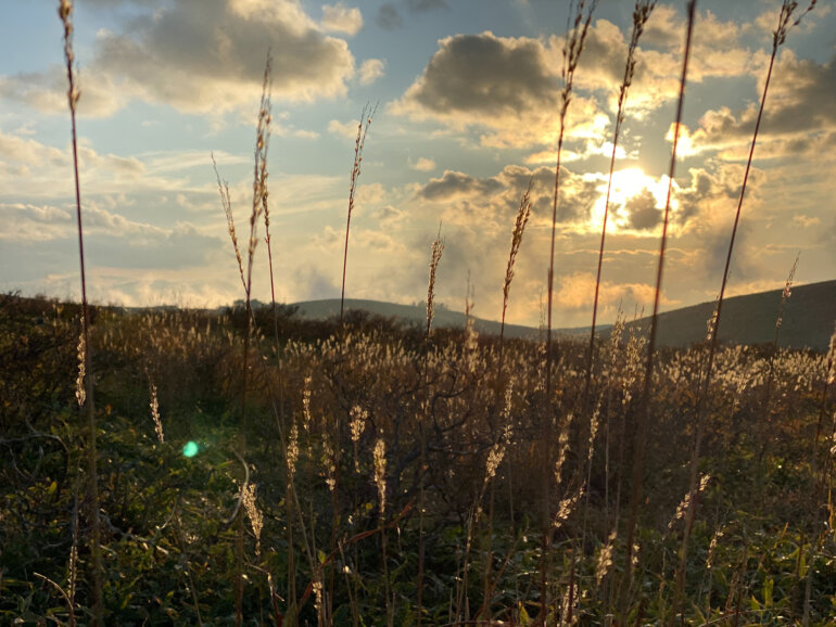 思い切ってススキに寄り切って撮影しても、手前のススキ、中間のボケたススキ、奥の稜線と奥行き感が自然と生まれます。