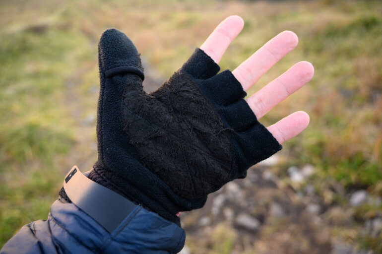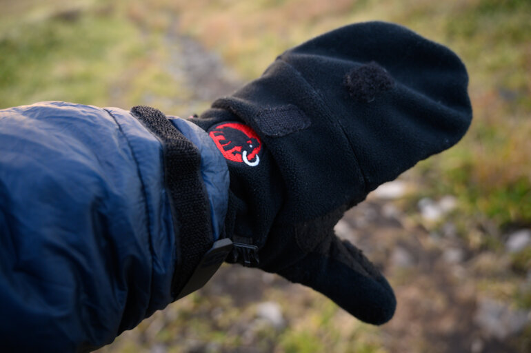 私が愛用しているのはミトン式で指を出すことができるグローブ。撮影時は直にスマホやカメラを指で操作して行動中は隠して保護する使い方をしています。厳冬期ではこの下に薄手にグローブを付け、オーバーグローブも着用することで保温力を高めています。