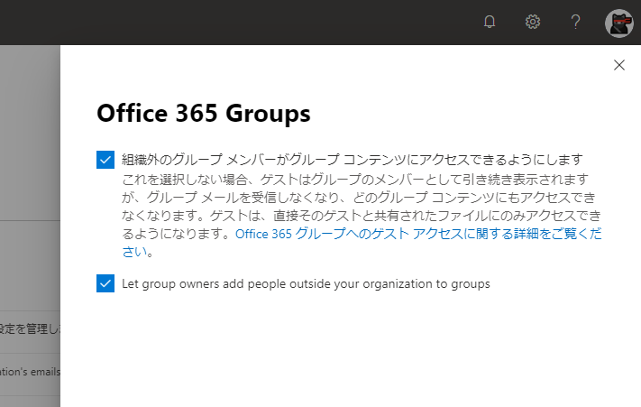なぜかここだけ設定名が英語なのですが、「グループの所有者が組織外のユーザーをグループのメンバーに追加できるようにする」といった意味合いでしょうか。