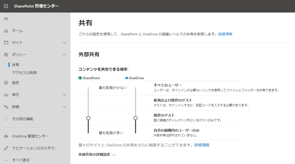 そのため、SharePoint Online と OneDrive for Business の外部共有設定も重要になります。