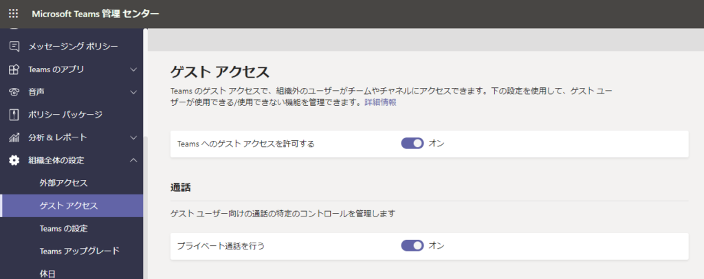 そして、忘れてはならないのが Microsoft Teams の設定です。これまでの設定を行ったとしても、Microsoft Teams 自体の設定を忘れていてはゲストと一緒に利用することができません。