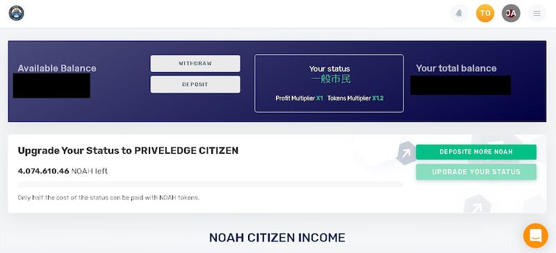冒頭前述の通り『Noah City Citizenship』の権利を得られた方は毎日インカムゲインでアンロックNOAHPが貰えます。