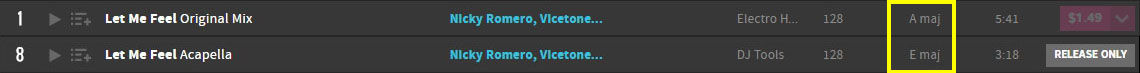 これは、アップロードされた曲をBeatportが機械で自動検出しているためだと思われますが、誤検出されることがあるのです。アカペラでは、構成音が少ないためにキー検出精度が下がることがあるようなので、オリジナルミックスの方も同時に確認すると良いでしょう。この場合A Maj(11B) が正解です。