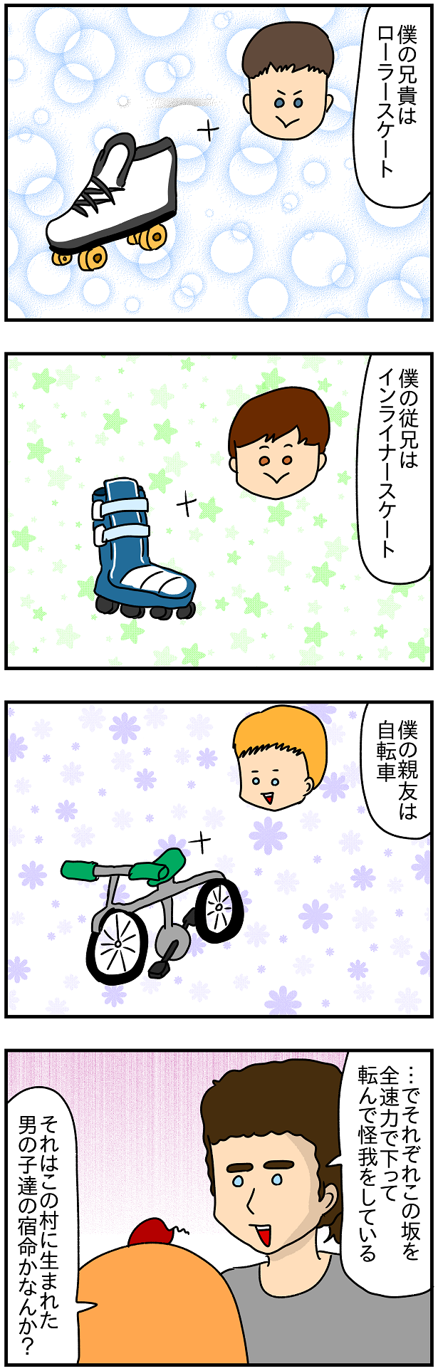 この村の男の子には長い坂を見ると道具を使って全速力で下りたくなるDNAが流れているんだろうか…?