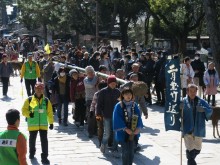 今年も京田辺市の山城松明(たいまつ)講による「二月堂竹送り」が2月12日に行われ、転害(てがい)門前(奈良市雑司町)で奈良街道まちづくり研究会による「お迎え式」が行われた。