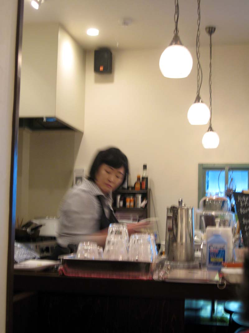 お店を建てるとき、飲食専門の業者さんではなく普通の大工さんと様々な店を見てまわり、あれがいい、こうして欲しいと要望したそうです。店内の壁には珪藻土、木は白木のまま、床材には自然塗料の柿渋を自分たちで時間をかけて塗り、できあがったお店は今年で9年目というけれど、こぎれいで自然の素材が少しずついい味わいをだしている。「ランチは店内が油っぽくなるからやらないのよ」と店内の佇まいをとても大切にされている。