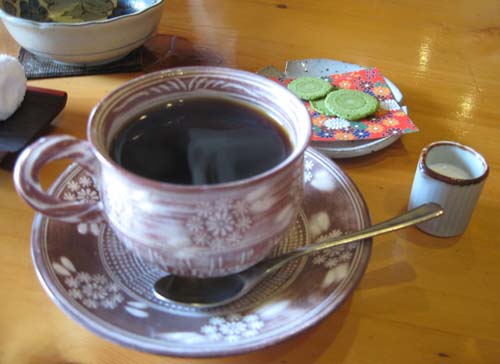こだわりは何ですか?とお聞きすると「そんな大したことは何もしていないよ」とご主人はいうけれど、珈琲に使う水は浄水器を通した水を使って、サイフォンで丁寧に淹れている。机の上にさりげなく置かれているお砂糖は茶色い“きび砂糖”。珈琲を入れる器は奥様が好きで集められたもので、カウンターの後ろに100以上が並べられ、定期的に入れ替えもされる。
