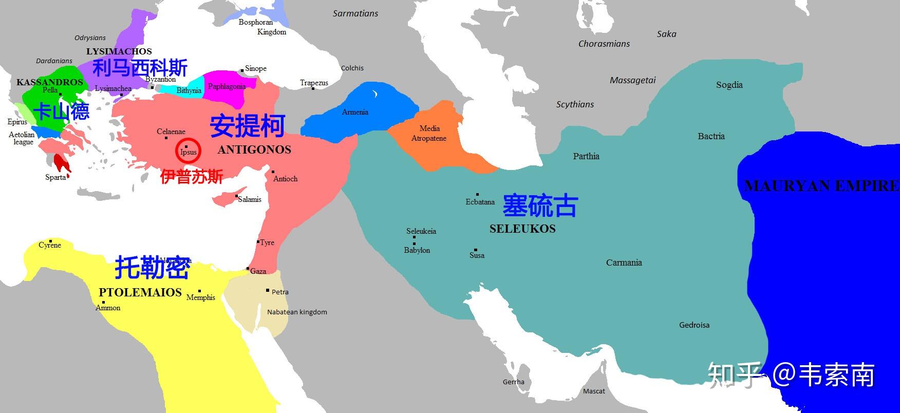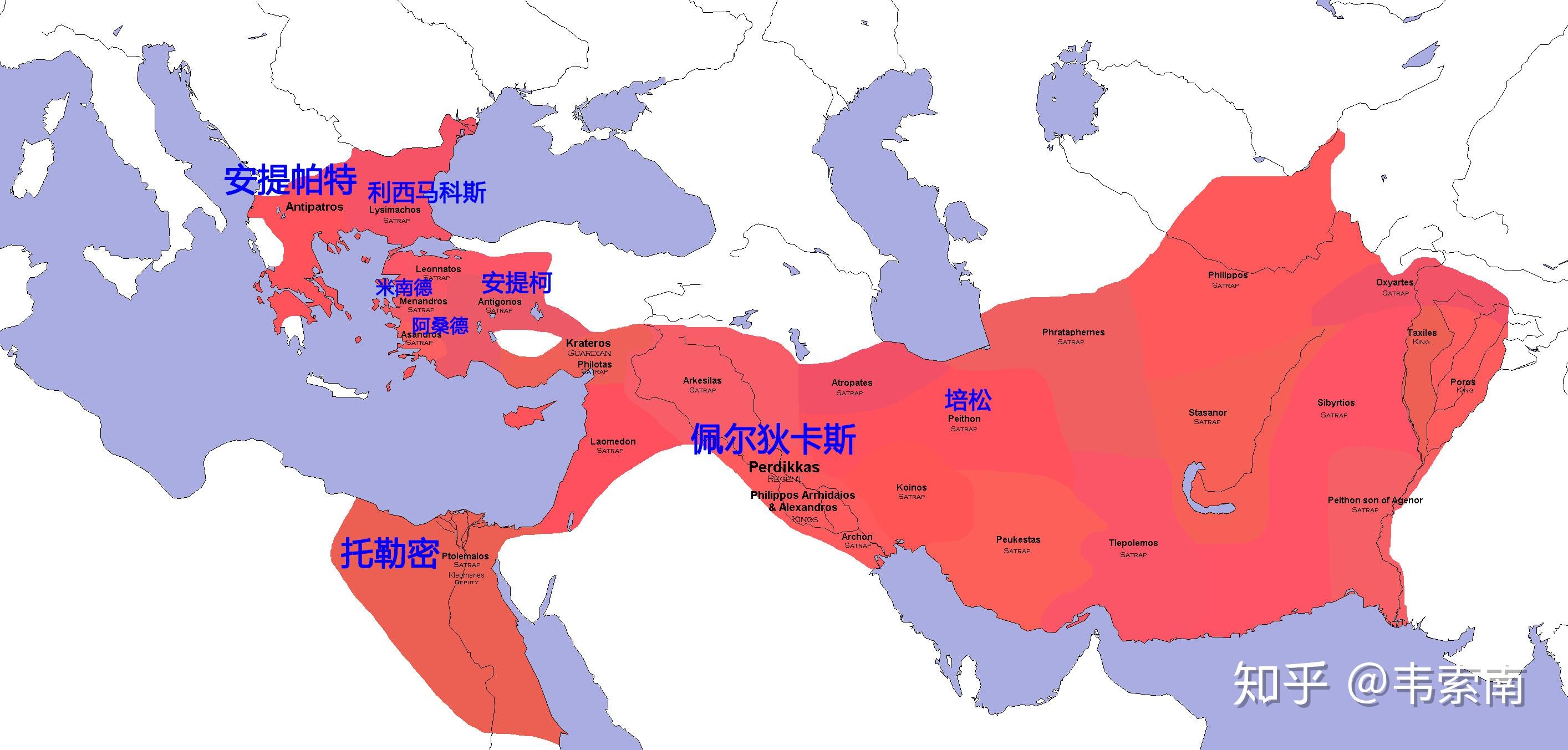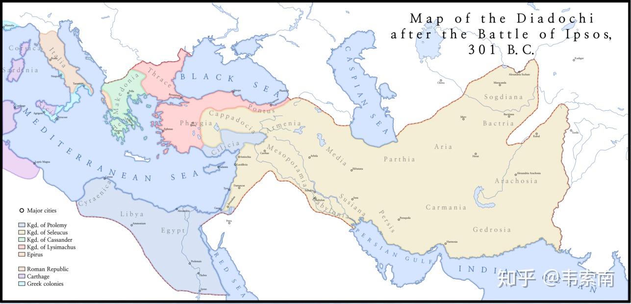 真实历史往往比小说还精彩。对于文化昌明的希腊,伟大光荣的罗马,很多朋友都是耳熟能详。但对于它们之间的历史,往往并不很了解,一般书上也就一笔带过。其实从亚历山大去世的前323年,到罗马征服希腊本土的前146年(也有人认为到托勒密灭亡的前30年),一般称作希腊化时代。这一时代受到的关注比较少,但却是西方世界主导权从希腊向罗马过渡的时期。最近对亚历山大帝国分裂后的继业者国家感兴趣。就动手查了一下,发现几乎没有完整的中文资料,但是确实有很多有趣的故事,于是简单写写,让后来者有个基本框架。我并非历史专业,也并非专研某个领域的深度爱好者,因此写的比较浅显,也肯定会有错漏。