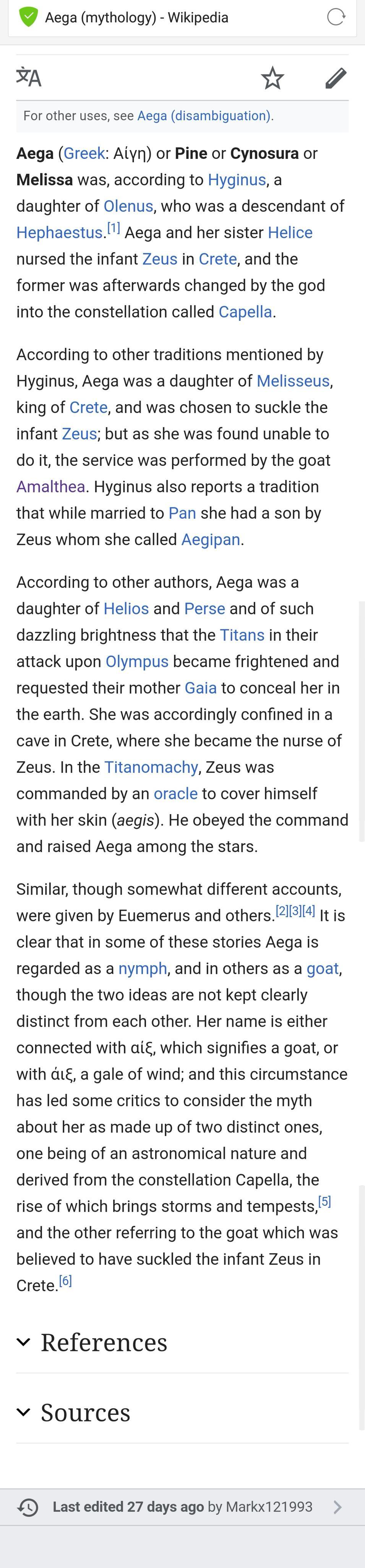 “卡普拉站在御夫座的左肩上……有些人称埃克斯为太阳神索尔[赫利俄斯]的女儿,她的身体的美丽超越许多人,但与此形成鲜明对比的是,她的脸非常可怕。提坦们被它吓坏了,乞求泰拉(大地)[盖亚]把她的身体藏起来,据说泰拉把她藏在克里特岛的一个洞穴里。后来,她成为了朱庇特[宙斯]的保姆,正如我们之前所说的。但是当朱庇特[宙斯]年轻时信心十足地准备与提坦作战时,神谕的回答告诉他,如果他希望获胜,就应该在山羊aigos的皮和戈尔贡的头的保护下继续战争。希腊人称之为圣盾埃癸斯。当上述的内容被完成后,朱庇特[宙斯]战胜了提坦,获得了王国的所有权。他用一张皮覆盖山羊剩下的骨头,给它们生命,纪念他们,用星星描绘它们。后来他把在他胜利时保护他的埃癸斯交给了密涅瓦[雅典娜]。”