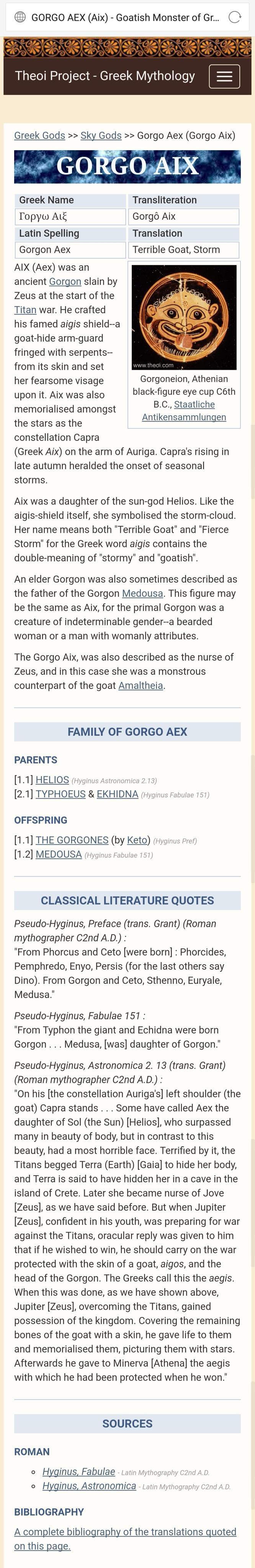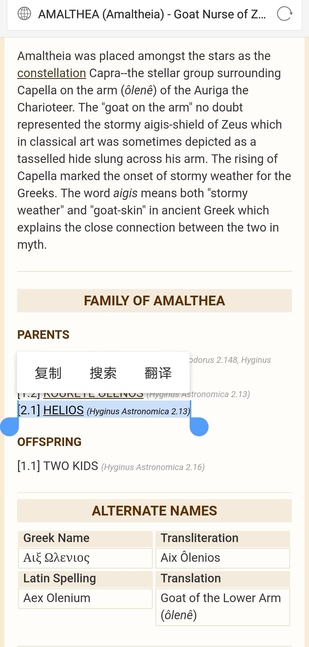 仔细阅读这段文字,我们会发现并没有哪里说了埃克斯是戈尔贡。圣盾埃癸斯是由山羊皮和戈尔贡的头组成的,但是没有任何证据可以说明山羊皮和戈尔贡的头来自同一来源。相反,我们很难想象太阳神的女儿,幼年神王的保姆会是一个戈尔贡,一个可怖的怪物。我们会注意到,埃克斯的身份更接近于希腊神话中给幼年宙斯哺乳的母羊阿玛耳忒亚(Amalthea),埃克斯也是朱庇特的保姆,也是一只母山羊——希腊语埃克斯(αἴξ)的本意就是山羊,上文中出现的山羊aigos其实就是埃克斯(αἴξ)的属格形式αἰγός.查theoi的Amalthea条目我们会发现以下内容: