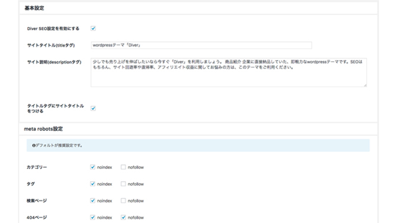 その他にも無料のワードプレステーマでは不安な内部SEO対策もDiverではあらかじめおこなわれており、常にアップデートし続けているので安心です。