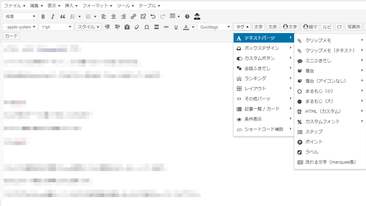ちなみにこのブログでも使用している「AFFINGER」の記事パーツ選択はこのような感じです。
