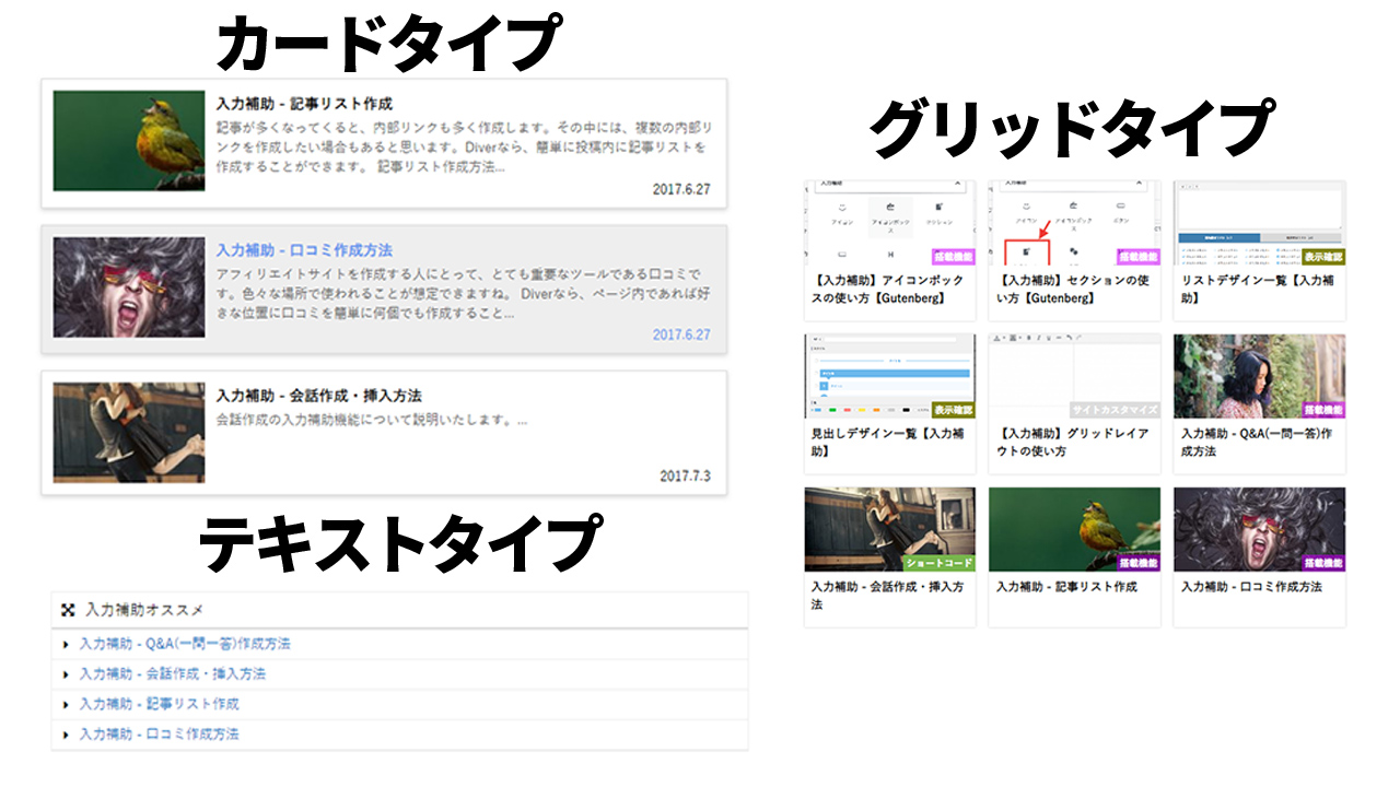 記事から他の記事へのリンクをする時に便利なカードもかなりの種類が用意されています。
