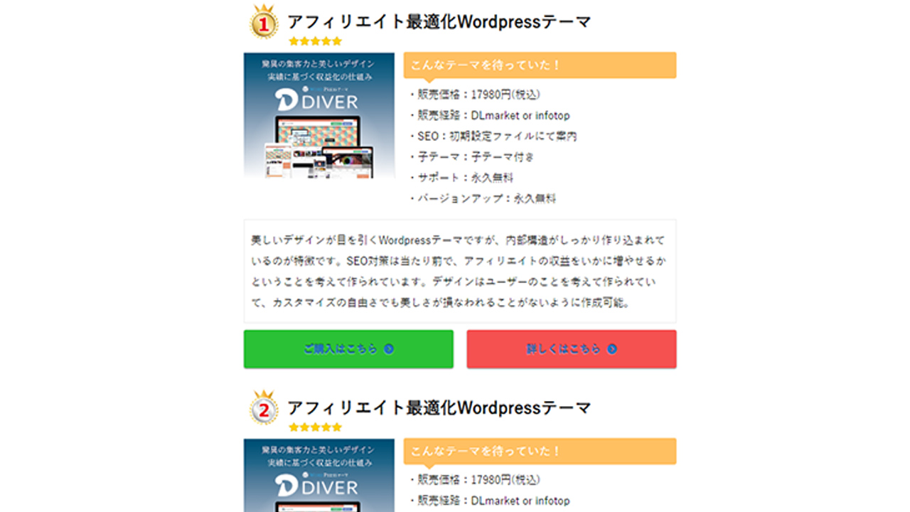 複数の商品を紹介する時にランキング形式で読者に見てもらいやすくなるパーツです。