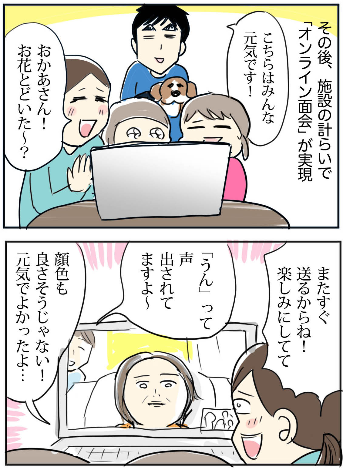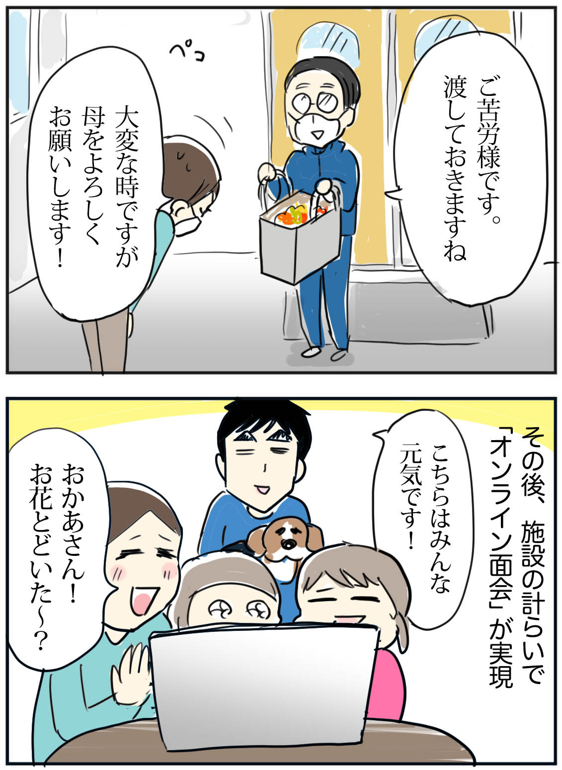 施設の方も大変でしょうに、ネット繋げて顔見せてくれるとか、入所者の方の事も家族の事も大事に思ってくださってるのかな…優しい気持ちを感じました。