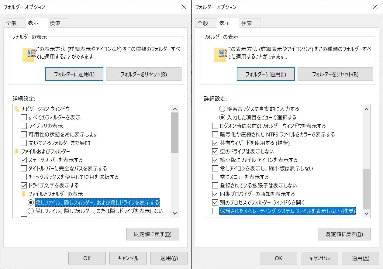 それでも隠しフォルダになっている場合は、隠しフォルダとシステムで保護されたファイルを表示するように設定する。