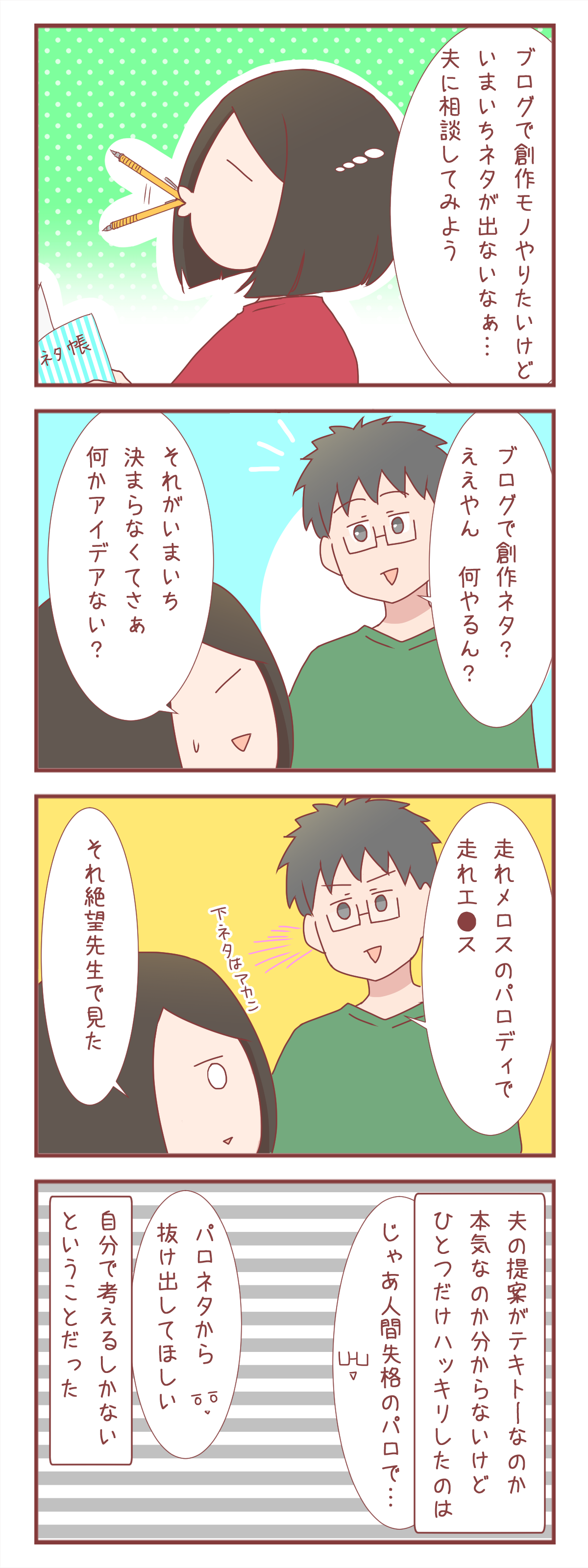 夫は私のブログとかに微塵も興味が無いので(たまに漫画描いてたら覗いてはくるけど、やってる内容には本当に興味ないらしい)アイデアを求めてもあんまり真面目に答えを返してくれません。