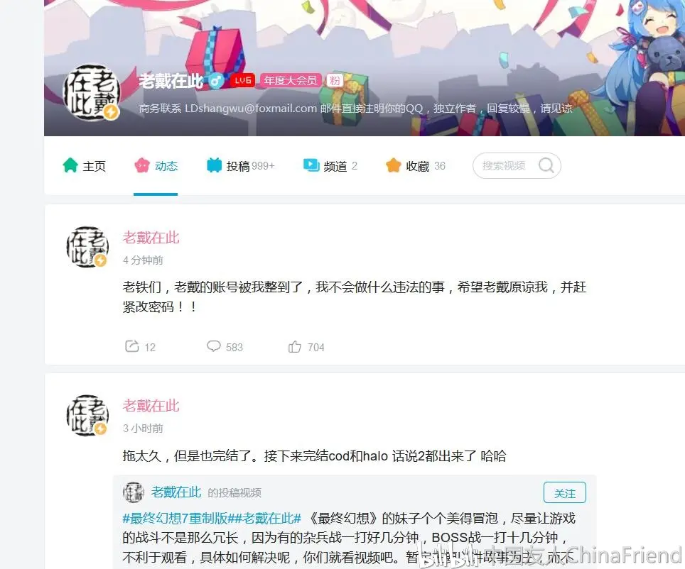 就在刚才,bilibili知名up老戴在此(UID2142762)的账号被盗了。