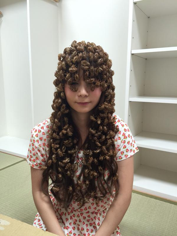 しょこたん、どんだけセミの抜け殻好きやねん。髪に付けたり、かぶったり f^_^; twitter.com/shoko55mmts/st…