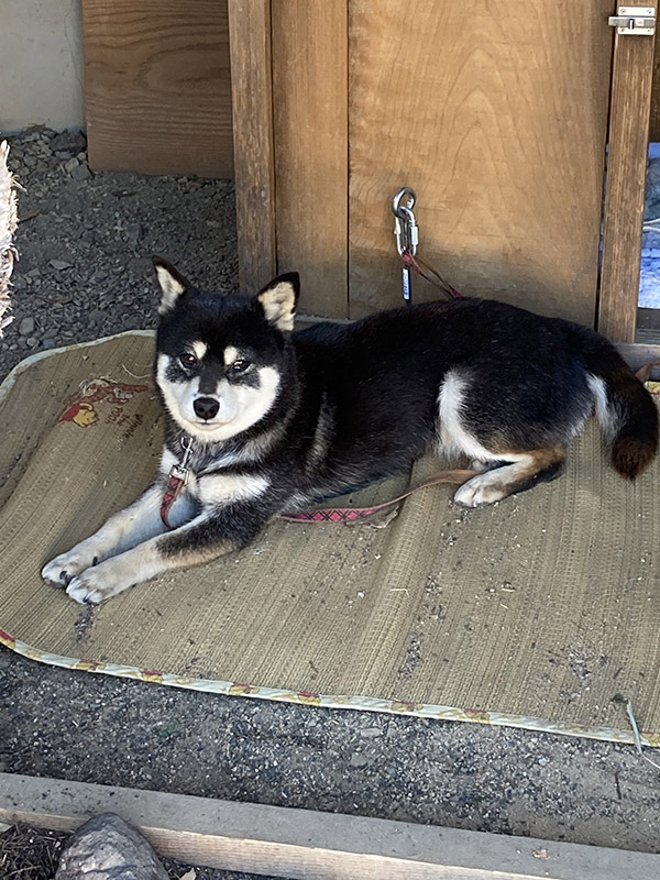 繁殖犬時代に室外飼育だったため、今はまだ室内への適性がなく、現在は軒下に屋根付きのかなり立派なスペースを作って生活しています。悪天候や寒い日は縁側に入ってもらうという感じ。