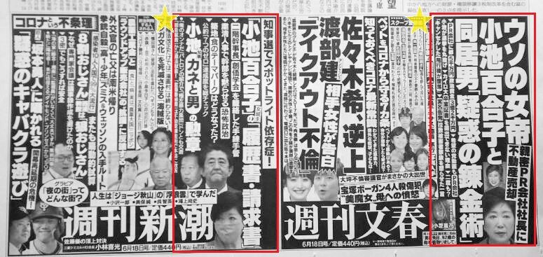 今日発売の新潮・文春はいずれも小池百合子知事が右トップだ。さすが多くのスキャンダルを抱える人物である。私はすでに医療逼迫が見えていた2月18日以降、中国に20万着もの医療用防護服を贈った理由を聞きたい。最前線で働く医療従事者の梯子を外し、都民の命を危機に晒した人に都政は任せられない。