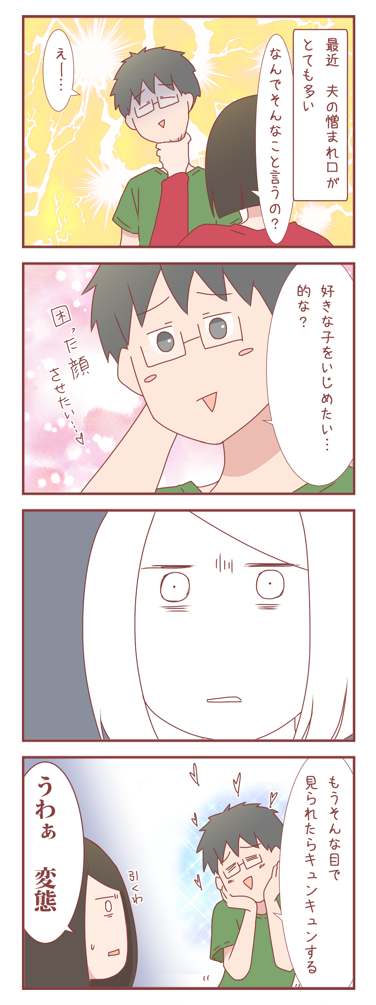 最近、夫の憎まれ口がまあまあひどいです。わざと私を困らせたり、怒らせたりするようなことを言っては楽しんでいる…。これを増長させてはいけないと、キュッと締めて理由を聞き出したところ、なんだか身に覚えのある展開になって…。