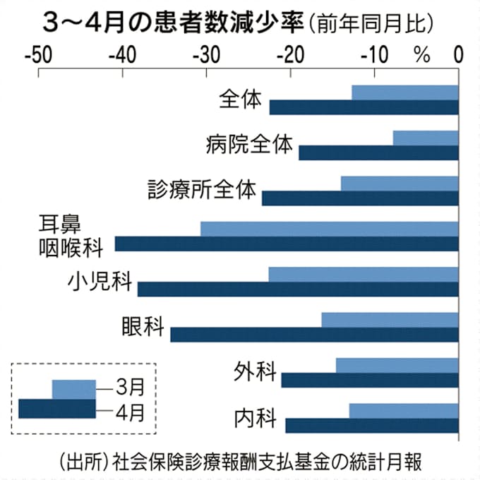 東京医科歯科大の川渕孝一教授(医療経済学)は「救急措置などが少ない診療科で患者が減った印象で、小児科は予防接種を遅らせた影響も考えられる。不急の受診が減った面と、必要な医療を受けられなかった面が複合しており、国は精緻に分析すべきだ」と指摘する。受診の適正化などの議論にも影響しそうだ。