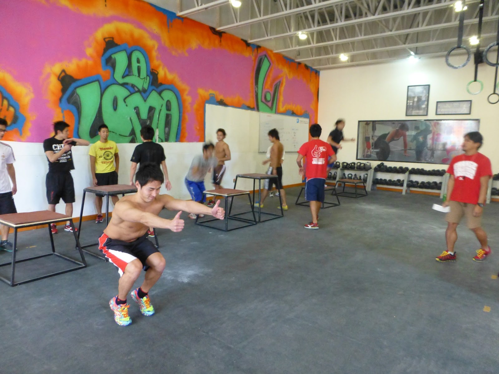 3日目となる本日は、午前中はゆっくり休んでもらい、午後に上記のうち、「クロスフィットルーム」を活用したプライオメトリクス系DRYを実施しました。