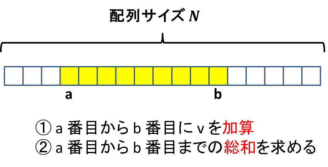 普通にやるとこれらはそれぞれ b - a + 1 箇所にアクセスすることになります。もし配列が巨大な場合、このようなクエリが大量に飛んで来られると途方もない時間がかかることになります。ビックデータという言葉が至るところに飛び交う昨今、このような大規模データを扱う大量のクエリを高速に実施していくタイプの要求はひたすらに高まっています。