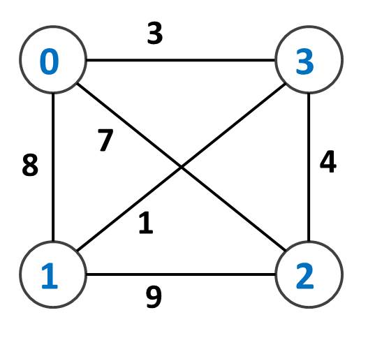 個の都市を、好きな都市から出発してちょうど一度ずつすべての都市を訪れたい。一度訪れた都市にはもう一度行くことはできない。所要時間を最短になるようにせよ。なお、街 から街 へと移動するのにかかる時間 [][] が与えられる。
