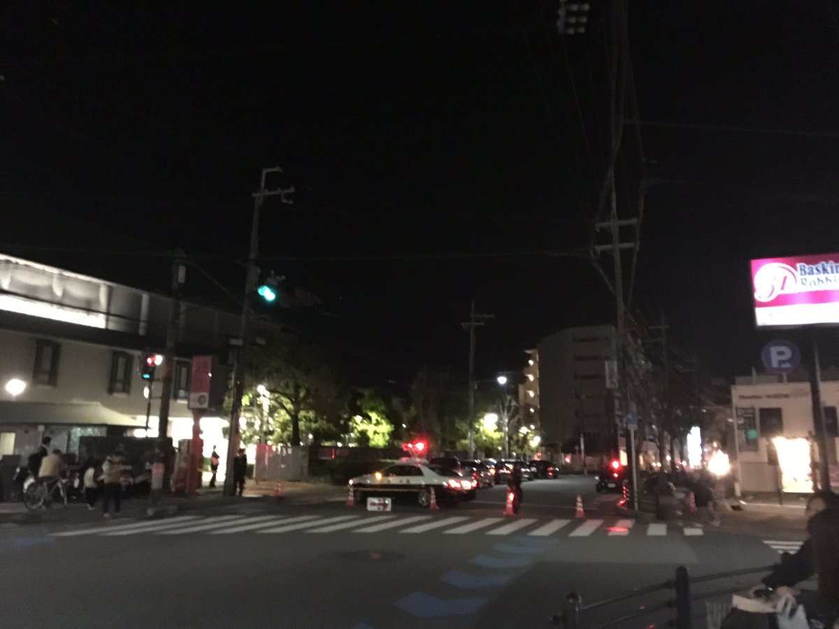 ロマンチック街道の創価学会らへんにパトカーめっちゃおる(・・;) がんこらへんも交通規制かけられてて目に見えるだけで七台くらいパトカーいて警察の人めっちゃ叫んでて とにかく怖い(・・;)