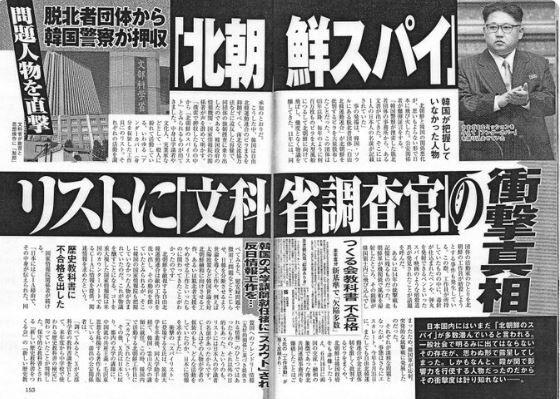 本日(7月23日)発売された徳間書店発行の週刊誌『アサヒ芸能』7月30日号は、「新しい歴史教科書をつくる会」を「一発不合格」にした文科省の主任教科書調査官(歴史担当)が、「北のエスピオナージ」だったことを報じた。3ページ建ての記事の概略は次の通り。