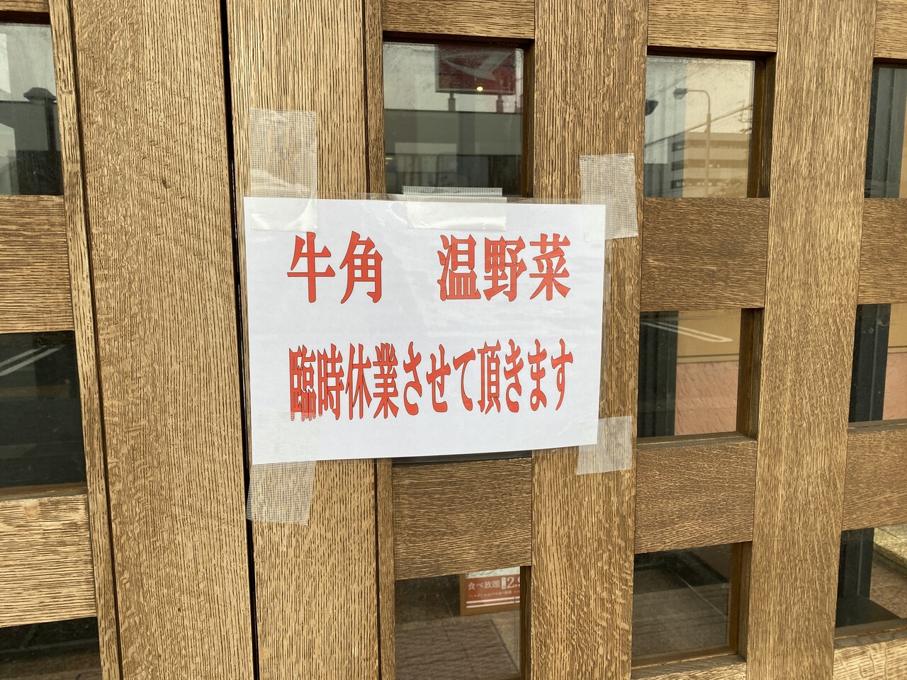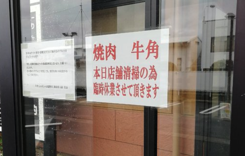 ※上記写真は3/30日のお昼ごろの牛角有玉店の入り口前に貼られていた「臨時休業」の張り紙です。